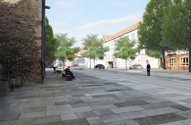 Die Fahrbahn wird auf je eine Spur zurückgebaut, die Straßenbahn fährt auf der Fahrbahn. Links und rechts gibt es Stellplätze für Anwohner und Kunden der Geschäfte. Breite Radwege, laufen mit ausreichend Abstand zu den parkenden Autos auf beiden Seiten der Straße entlang. Die alten Bäume werden erhalten, müssen aber nicht mehr in winzigen Löchern wachsen, sondern stehen in einem Breiten Streifen aus einer wassergebundenen Decke – Sie spenden nun nicht mehr den Autos Schatten, sondern den Fußgängern, gleich ob sie gehen oder z.B. im Außenbereich eines Cafés sitzen. Der Fußweg ist stattliche 4m breit, so dass genügend Platz vorhanden ist, um angenehm Laufen oder sich Schaufenster ansehen zu können.