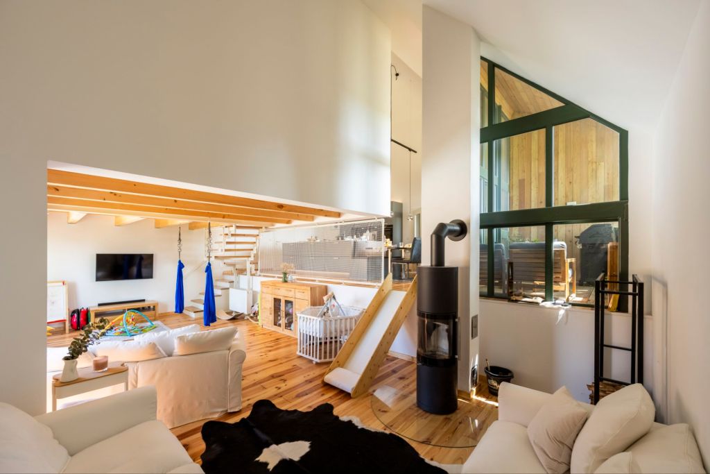 Das Dachgeschoss wurde neu errichtet und dem Haus seine ursprüngliche Form wiederzugeben. Er wurde komplett vorgefertigt und innerhalb nur einer Woche wurde der alte Dachstuhl komplett ausgetauscht. Dadurch ergab sich die Möglichkeit für einen modernen Ausbau. Der neue Wohnraum besticht durch einen mehrgeschossigen Raum, mit mehreren Ebenen, die teilweise frei von der Decke hängen und das Licht fließen lassen.