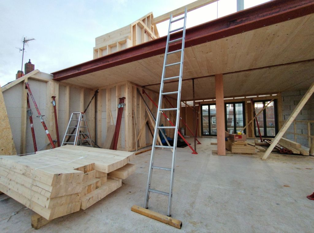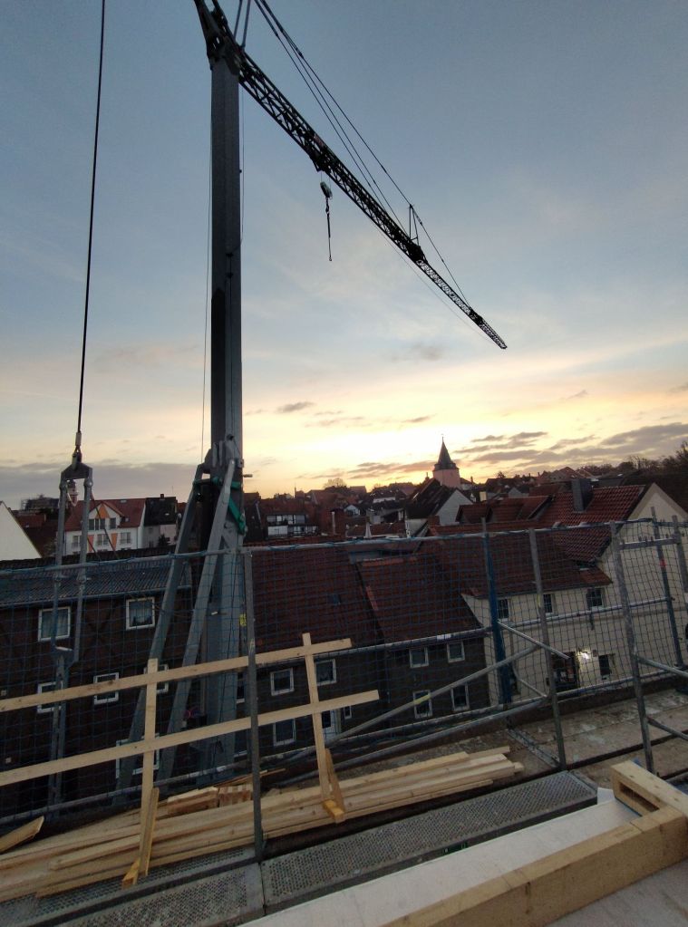 Der Rohbau des Neubaus in der Leuckartstraße 17 hat seine endgültige Höhe erreicht. Der Bau ist überwiegend als Holz-Fertigteilbau errichtet worden und konnte in wenigen Wochen von der Bodenplatte bis zum First im 3. Obergeschoss wachsen. Die Wände wurden vor Ort errichtet, die Vollholzdecken kamen fertig aus dem Abbundwerk.